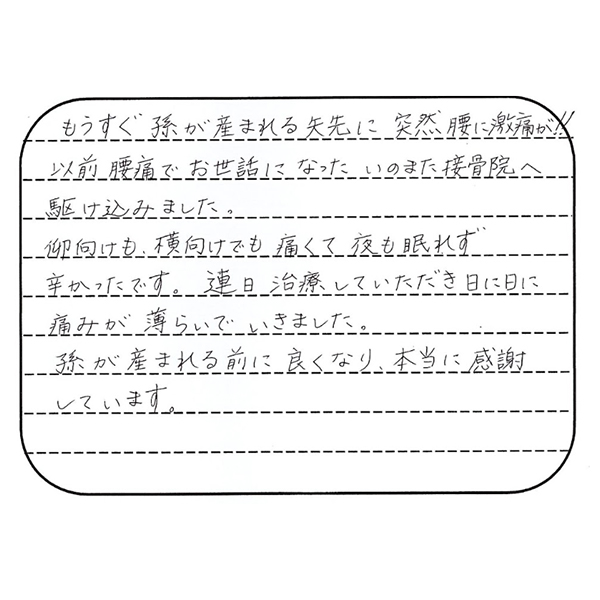 もうすぐお孫さんが産まれる大切な時期に、突然の腰の激痛(ぎっくり腰・急性腰痛)寝返りもつらく、夜も眠れないほどだったとのこと、本当にお辛かったですね。