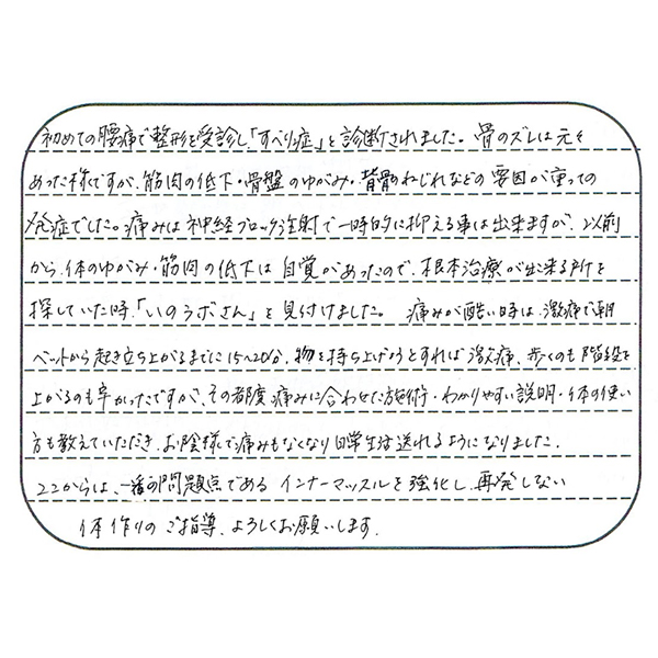 初めての腰痛で整形外科を受診し、「すべり症」と診断されました。骨のズレは元々あった様ですが、筋肉の低下・骨盤のゆがみ・背骨のねじれなどの要因が重なっての発症でした。痛みは神経ブロック注射で一時的に抑えることはできますが、以前から体のゆがみ・筋肉の低下は自覚があったので、根本治療ができるところを探していたとき、「いのラボさん」を見つけました。痛みがひどいときは、激痛で朝ベッドから起き立ち上がるまでに15~20分、物を持ち上げようとすれば激痛、歩くのも階段を上がるのも辛かったですが、その都度、痛みに合わせた施術、わかりやすい説明、体の使い方を教えていただき、おかげさまで痛みもなくなり、日常生活を送れるようになりました。