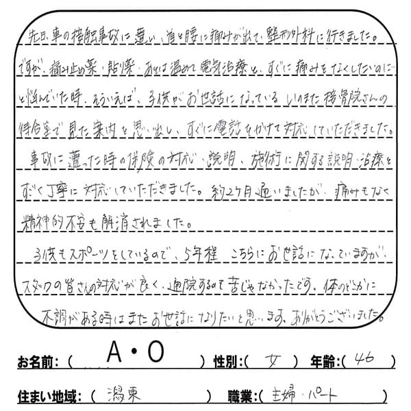 先日、車の接触事故に遭い、首と腰に痛みが出て、整形外科に行きました。ですが、痛み止め薬、貼り薬、あとは温めて電気治療と、すぐに痛みをなくしたいのに…と悩んでいた時、そういえば、子供がお世話になっている、いのまた接骨院さんの待合室で見た案内を思い出し、すぐに電話をかけて対応していただきました。