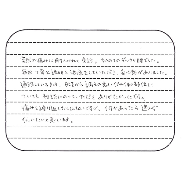 突然の痛みに耐えかねて受診。初めてのぎっくり腰でした。毎回丁寧な説明と施術をしていただき、安心感がありました。
