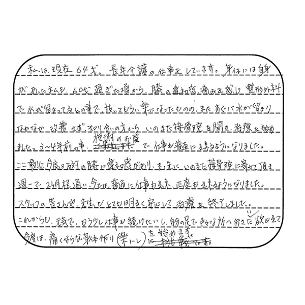 私は現在64才。長年、介護の仕事をしています。身体には自信があった私も、60才を過ぎた頃から、膝の違和感、痛みを感じ、整形外科で水が溜まっているとのことで、抜いてもらい楽になったものの、またすぐに水が溜まり、なかなか改善せず、知り合いの方からいのまた接骨院を聞き、治療を始めました。3~4年前のこと、施術のおかげで仕事も普通にできるようになりました。