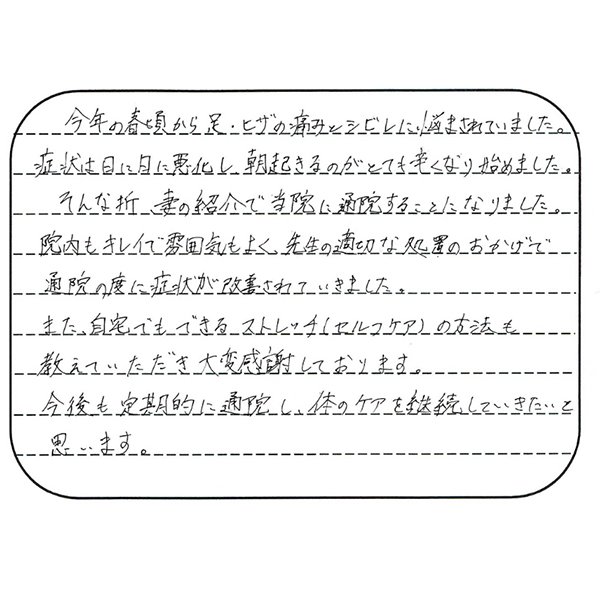 今年の春頃から足・ヒザの痛みとシビレに悩まされていました。症状は日に日に悪化し、朝起きるのがとても辛くなり始めました。