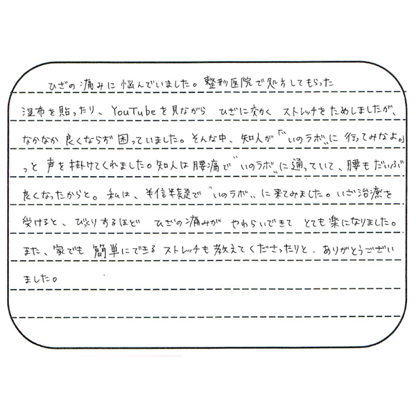 ひざの痛みに悩んでいました。整形医院で処方してもらった湿布を貼ったり、YouTubeを見ながらひざに効くストレッチを試しましたが、なかなか良くならず困っていました。そんな中、知人が「”いのラボ”に行ってみなよ」と声を掛けてくれました。知人は腰痛で”いのラボ”に通っていて、腰もだいぶ良くなったから、と。私は、半信半疑で”いのラボ”に来てみました。いざ施術を受けると、びっくりするほどひざの痛みがやわらいできて、とても楽になりました。