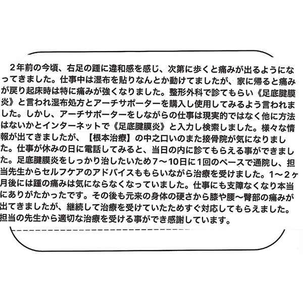2年前頃から右足の踵に違和感が出て、次第に歩くと痛い状態になり、お仕事中は湿布でなんとか動けても、帰宅後に痛みが戻ったり、起床時は特に痛みが強い、本当に大変だったと思います。整形外科で足底筋膜炎と言われ、湿布やアーチサポーターも試された中で、「他に方法はないか」と調べて当院を見つけてくださったこと、心より感謝いたします。