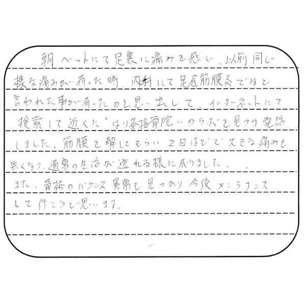 朝、ベッドにて足裏に痛みを感じ、以前同じような痛みがあったとき、内科にて足底筋膜炎ではと言われたことがあったのを思い出して、インターネットにて検索して近くに”はり灸接骨院いのラボ”を見つけ、電話しました。筋膜を解してもらい、2日ほどで大きな痛みもなくなり、通常の生活が送れるようになりました。