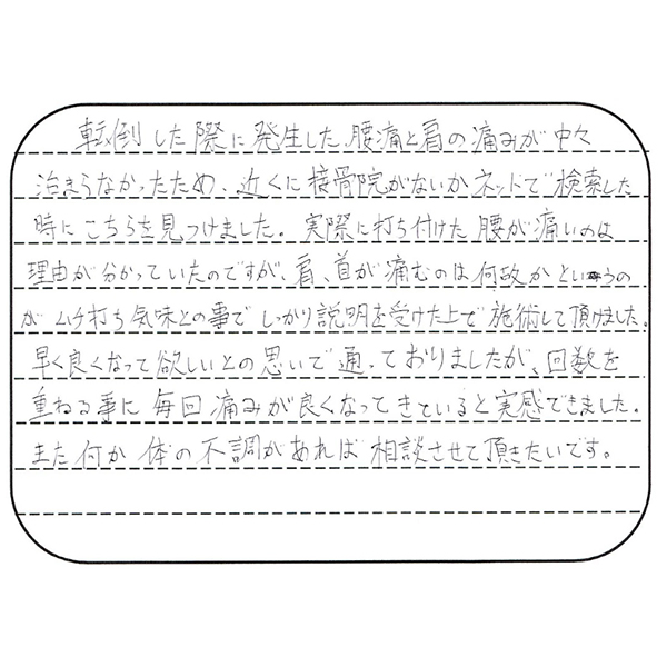 また、何かあった時は必ずいのまた接骨さんにお世話になりたいです。