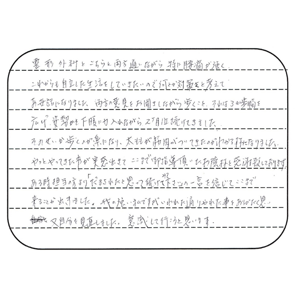 スタッフの皆さんや先生もとても明るく、安心して治療を終了しました。これからも元気で、もう少し仕事も続けたいし、自分の足で色々なところへ行きたい欲も出て、今度は痛くならない身体作り(楽トレ)を始めます。