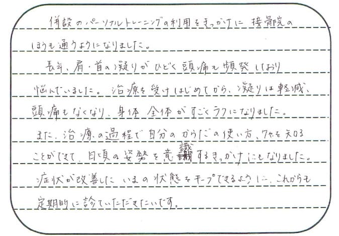 併設のパーソナルトレーニングの利用をきっかけに、接骨院のほうも通うようになりました。長年、肩・首の凝りがひどく、頭痛も頻発しており悩んでいました。施術を受けはじめてから、凝りは軽減、頭痛もなくなり、身体全体がすごくラクになりました。