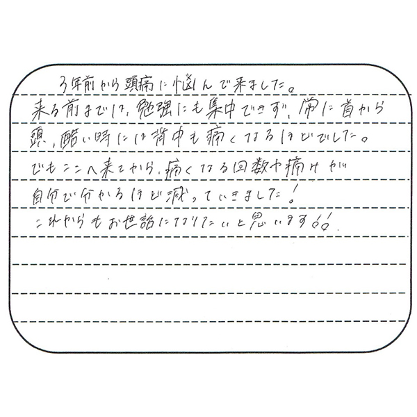 肩こり、頭痛であっても同じことです。 頭痛の方は、是非痛み止めを手放す生活をとりもどしてください。