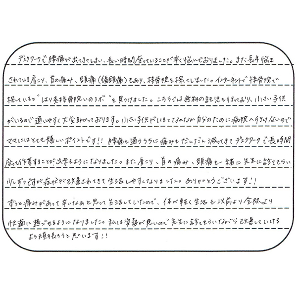 ・根本的な原因にアプローチしていくので肩こりなどその他の症状を含めて、症状の再発が発生しにくい状態を作る事ができる